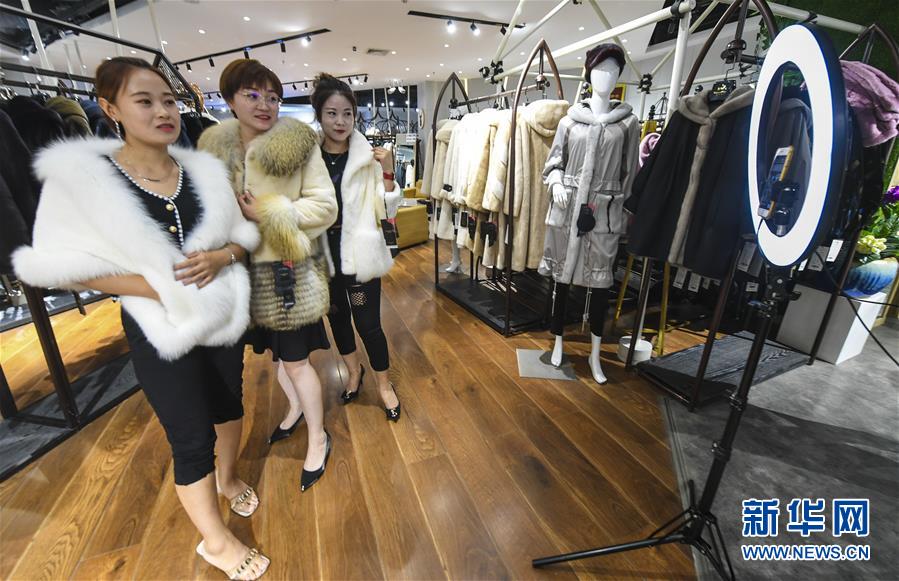 7月24日,枣强县一家皮草商城的模特利用直播平台展示裘皮服装。 裘皮产业是河北省枣强县的特色传统产业,今年以来,该县积极引导裘皮商户通过线上直播的方式销售产品,为当地带来良好的经济效益。 新华社记者 李晓果 摄