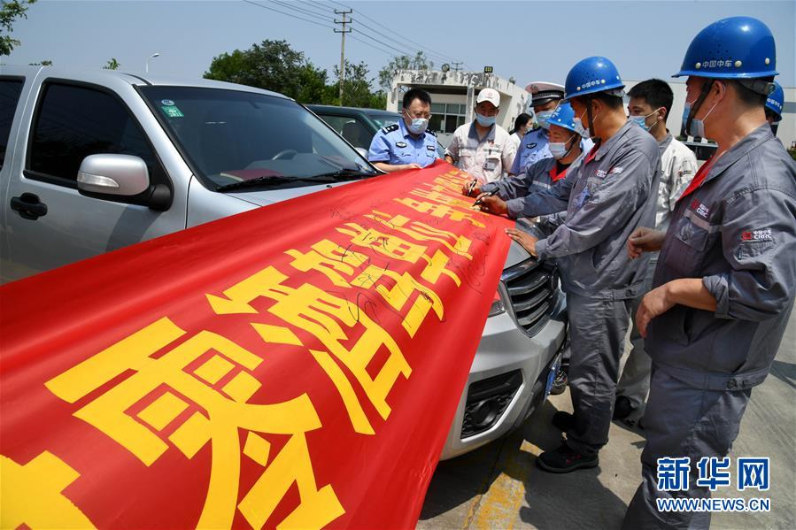 7月24日,在青岛中车四方车辆物流有限公司园区内,驾驶员在“拒绝酒驾”宣传横幅上签名。 近日,青岛高新区交警大队陆续在部分企业中开展“零酒驾”示范单位创建活动,通过酒驾危害宣传、酒驾案例分析、酒精检测实验、安全责任书签订等形式,在职工中点对点开展“拒绝酒驾”安全教育,并协助辖区企业建立起“零酒驾”机动车和驾驶人管理台账,使其“醉驾入刑”知晓率达100%。 新华社记者 李紫恒 摄