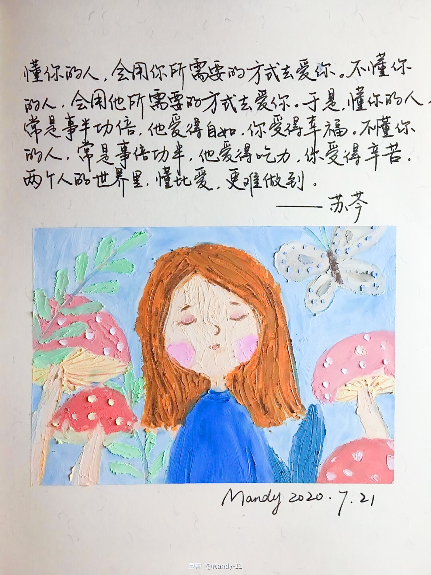 如果人在旅途,只带了本子和笔,她就尝试用日常彩妆眼影和腮红画画。比如,画上一位花间的女孩,写下一句话:“成长就是今夭已经累瘫,第二夭还是开心地出发。关于未来,它那么长,你永远不知道会在下一个转角遇见什么”。
