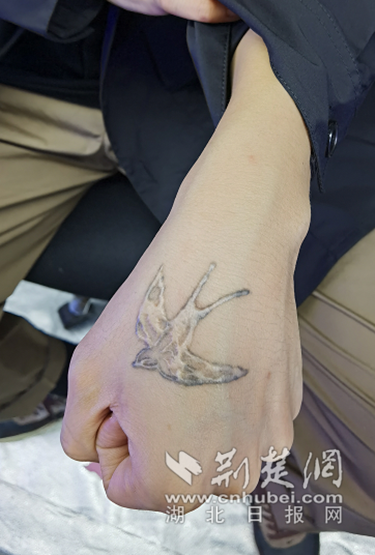 小斌回家后越来越后悔,半个月前,他再次来到那家纹身店,打算把手背的纹身图案洗掉,然而不知是仪器问题,还是纹身师操作的问题,纹身并未完全洗掉,两周后,手背“燕子”的轮廓变得更加立体和明显。7月26日,母亲带着小斌来到武汉大学中南医院,经过检查确诊为疤痕增生。