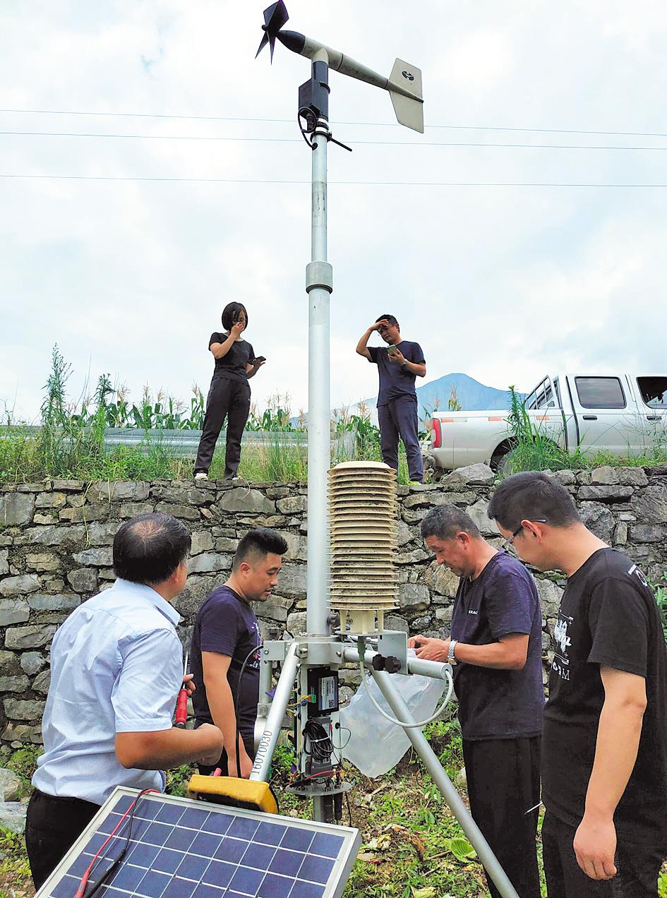 7月25日,恩施市沙子坝滑坡体上方,工作人员安装便携式移动气象站,精准监测气象,服务抢险救援。 (视界网 张洪刚 摄)