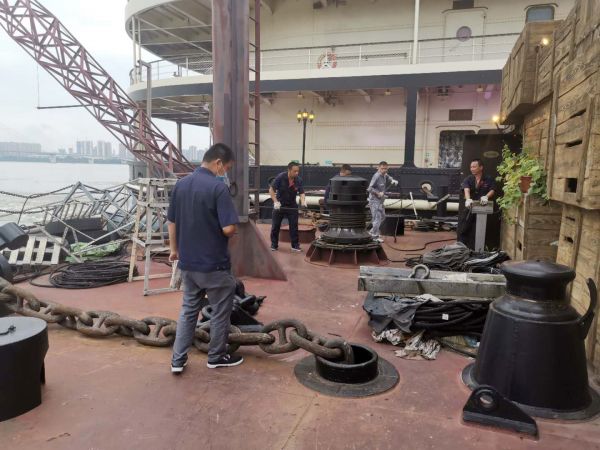 趸船绞锚调整。