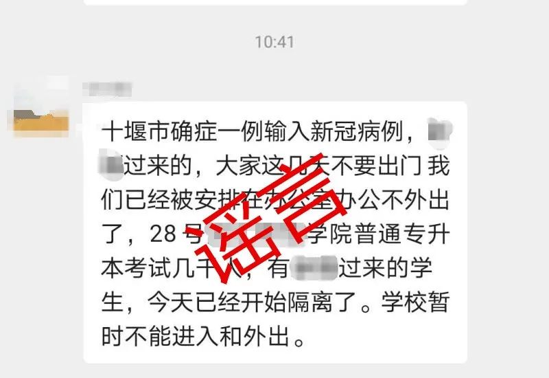 近日,市内多个网络群组内有消息称“十堰市确症一例输入新冠病例,××过来的,××学院已经开始隔离了”。