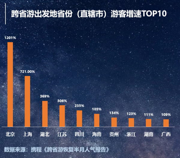 跨省游恢复后,各个出发地、目的地人气不一。根据携程平台的数据,北京、上海的游客出游意愿更强烈,环比跨省游开放之前增幅分别达到了1201%和721%。湖北的出游人数环比增长了369%。而从“跨省游出发省市人气排行榜”来看,跨省游人数最多的是四川、广东和云南,湖北排名第十。