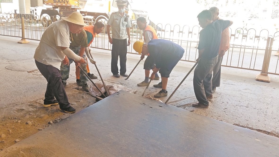 记者随后联系了洪山区城管执法局,工作人员来到现场后,当即联系了负责该路段维护的地铁施工方工作人员。工作人员到达现场后,用铁锹将钢板撬起,把废弃的棉絮、麻袋垫压在钢板与路面之间的空隙处(如图)。