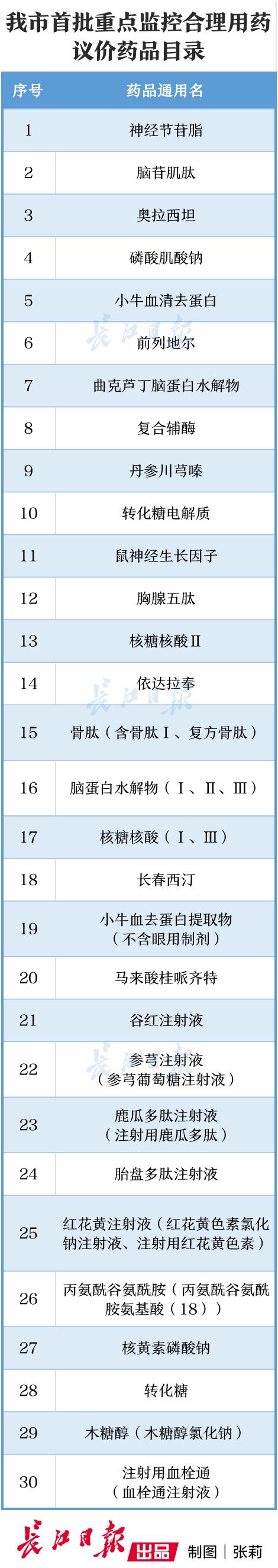 武汉市首批公布的重点监控药品议价目录,在国家、湖北省首批公布的25种重点监控药品的基础上,结合武汉地区疾病发病情况和公立医院用药情况,增加丙氨酰谷氨酰胺等5个品种,达到30个。