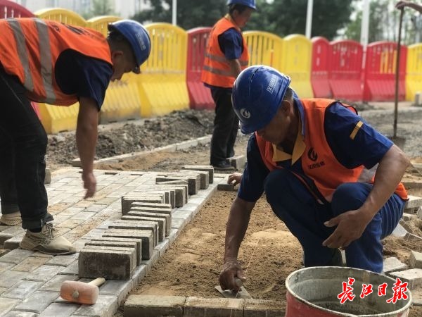 长江网8月4日讯(记者王慧纯 通讯员肖赟)4日下午,芳草五街和芳草东路交界处,5名道路维修工人正在烈日下铺设人行道地砖,豆大的汗珠直往下滴。