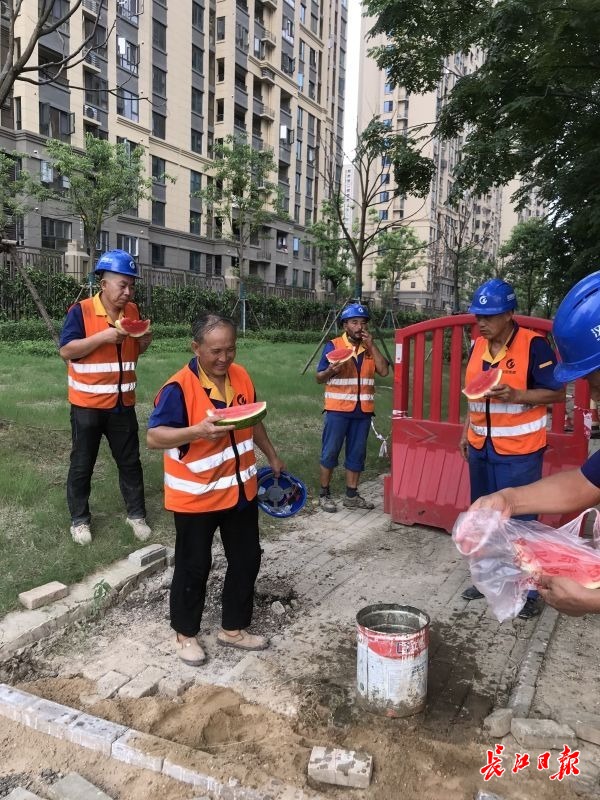 施工间隙,师傅们吃西瓜降温。 记者王慧纯 摄