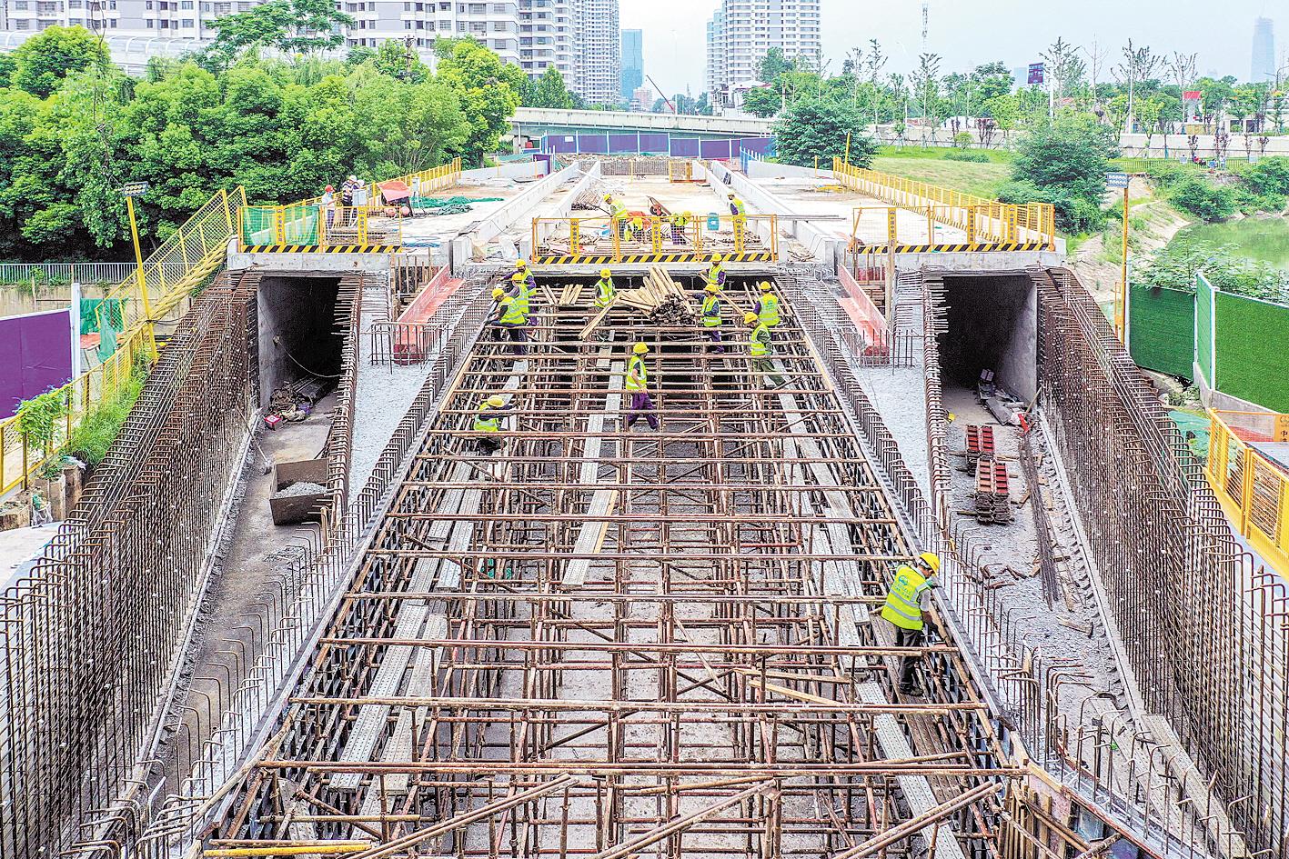 七月三十日,中铁七局武汉公司的建设者们,正在加紧对武九综合管廊施工。 (湖北日报全媒记者 梅涛 通讯员 郭强 摄)