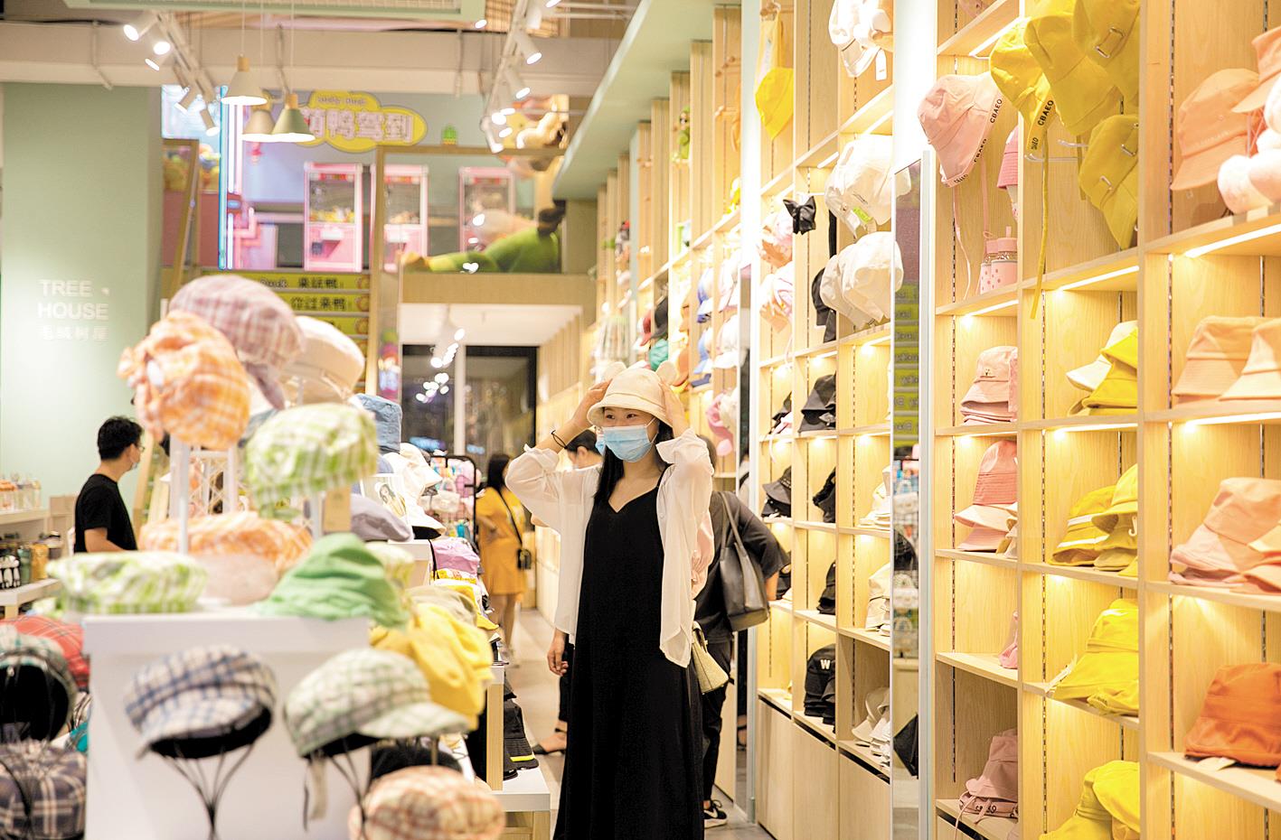 8月7日晚,市民在楚河汉街商铺选购商品。6月以来,武汉楚河汉街推出“夜间集市”。每当夜幕降临,楚河汉街人来人往,服饰、配饰、文创、餐饮等吸引了大量消费者。