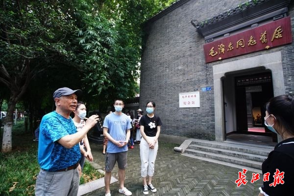 红色星干线志愿讲解团老党员邓广东(左)在毛泽东同志旧居外,给硚口城市建设投资有限公司的党员们讲党课。记者何晓刚 摄
