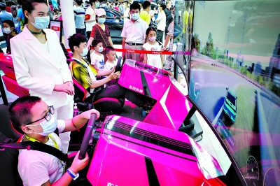 13日,一名小朋友在模拟体验区体验驾驶赛车。