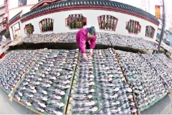 2015年2月5日,东西湖区柏泉街茅庙集村民在晒鱼。
