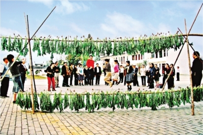2006年10日23日,一群游客在东西湖区慈惠街石榴红村玩跳绳。