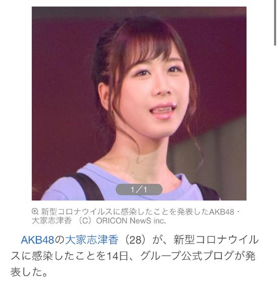 网易娱乐8月15日报道 AKB48成员大家志津香(28)确认感染新型冠状病毒。 据悉,她在8月11日白天体温是37.7度,当天下午降温,没有咳嗽,味觉异常。8月12日有倦怠感下午检查,PCR结果8月13日白天确诊。此前,日本女团AKB4823岁成员田北香世子证实确诊,成为AKB48首位确诊成员。