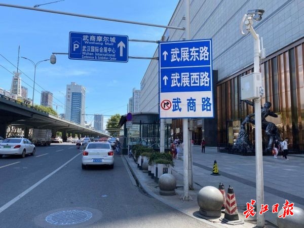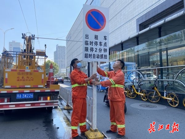 8月17日上午11时,武汉广场门前的出租车排队处,江汉区交警大队在此安装了出租车限时停车2分钟的标牌,以规范商圈停车秩序,保障市民购物便利。(通讯员董冠男 摄影报道)
