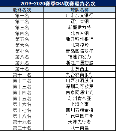 2019-2020赛季CBA联赛各球队最终名次为:广东、辽宁、新疆、北京首钢、浙江稠州银行、北京北控、青岛、福建、浙江广厦、山东、吉林、山西、深圳、南京同曦、苏州肯帝亚、上海、四川、广州、天津、八一。
