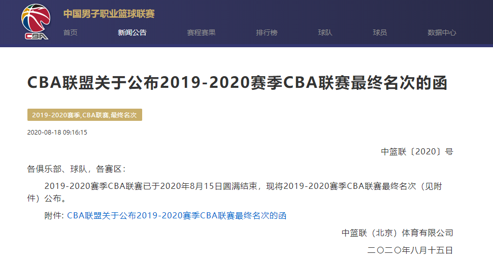 《CBA联盟关于公布2019-2020赛季CBA联赛最终名次的函》全文如下: