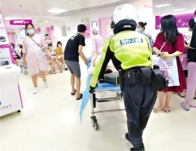 交警汤鸣宇和同事董伟强借来担架车,将孕妇推进产房。