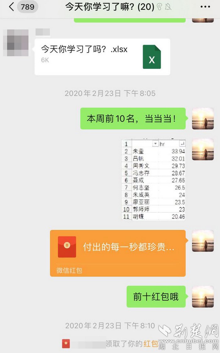 尹静是韩国东亚大学在读博士、旅游管理教研室教师,同时也是旅管17302班班主任。2019年下半年,尹静老师要求全班学生签订“学习合同”,明确专升本目标并为之努力奋斗。疫情爆发后,为缓解备考学生的焦虑情绪,提高自学效率,尹静建立了“今天你学习了嘛?”学习群,要求学生每日汇报学习进度,交流学习心得,互相激励。为激发学生的复习备考动力,尹静每周自掏腰包发红包奖励学习时长排在前十的学生。