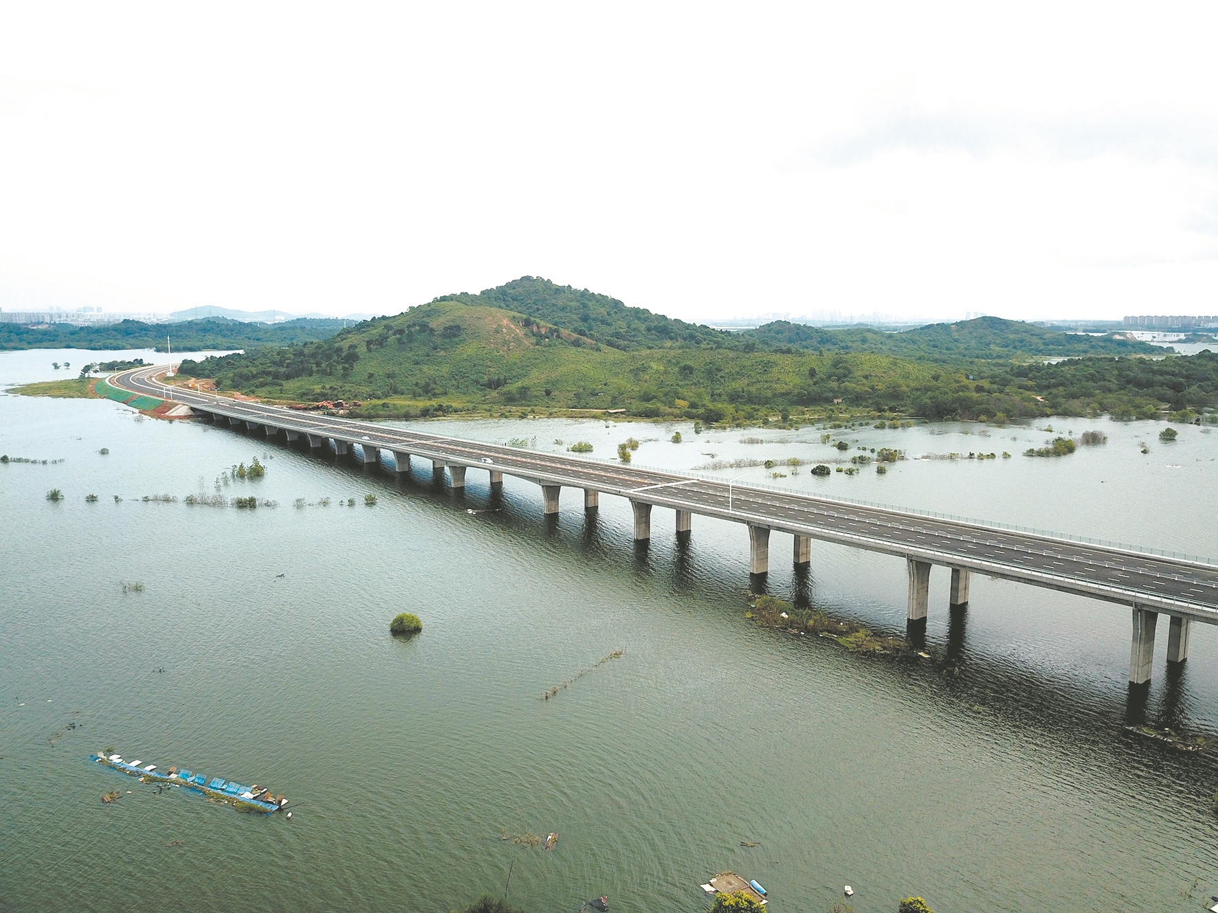武汉经济开发区官莲湖畔,一条新建的快速路已悄然立起在美丽的湖光山色之间,从北面官莲湖东路,自北向南跨越下善湖后绕行鸳龙山,向南纵跨通顺河,顺接军纱大道汉南段。两段路基将下善湖、鸳龙山两座大桥串连在一起,宛如一条长龙卧伏在翠山绿丘、湖水粼粼之中,形成一副天然绝伦的美景。这条全长3.76公里,设计车速每小时60公里,双向6车道,宽阔通畅的快速路建成,让“中国车都”武汉经济开发区区域路网更加优化、便捷。