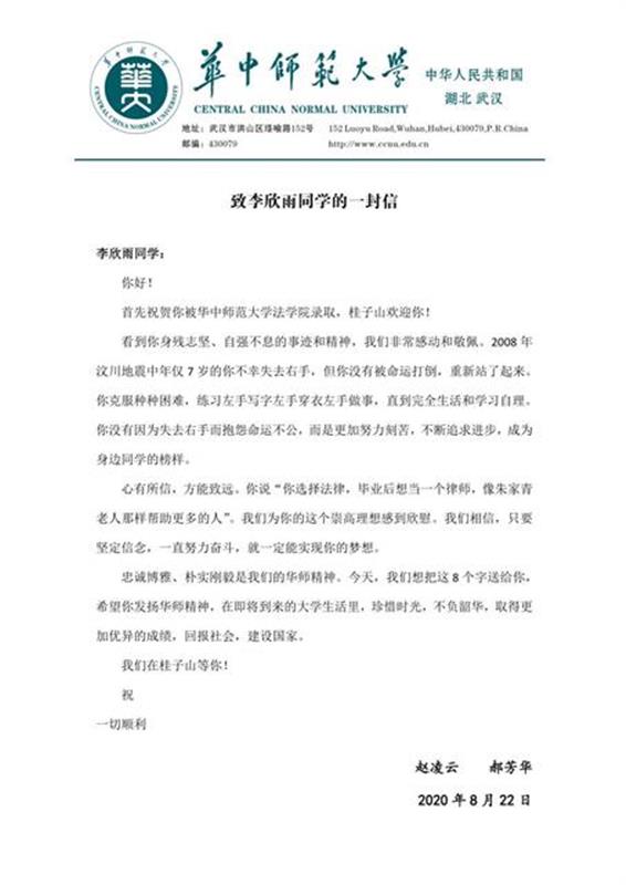 “看到你身残志坚、自强不息的事迹和精神,我们非常感动和敬佩。2008 年汶川地震中,年仅 7 岁的你不幸失去右手,但你没有被命运打倒,重新站了起来。你克服种种困难,练习左手写字左手穿衣左手做事,直到完全生活和学习自理。你没有因为失去右手而抱怨命运不公,而是更加努力刻苦,不断追求进步,成为身边同学的榜样。”信中,赵凌云与郝芳华鼓励李欣雨发扬华师精神,在即将到来的大学生活里,珍惜时光,不负韶华,取得更加优异的成绩,回报社会,建设国家。