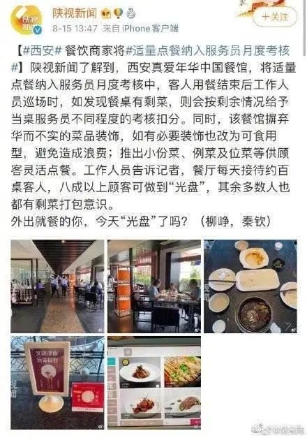 据报道,西安某餐馆近日推出“将适量点餐纳入服务员月度考核”的举措。这一考核办法规定,客人用餐结束后工作人员巡场时,如发现餐桌有剩菜,将会按剩余情况给予当桌服务员不同程度的考核扣分。