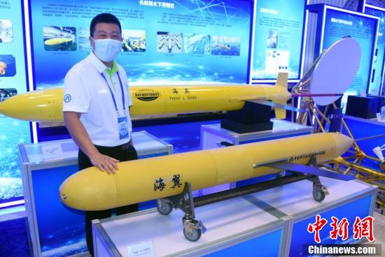 8月23日,中国2020年全国科技活动周暨北京科技周启动式,通过视频连线在北京主会场和湖北武汉分会场同步举行,今年活动周主题为“科技战疫 创新强国”。图为中国科学院沈阳自动化研究所研制的“海翼”水下滑翔机,在启动式上亮相展示。