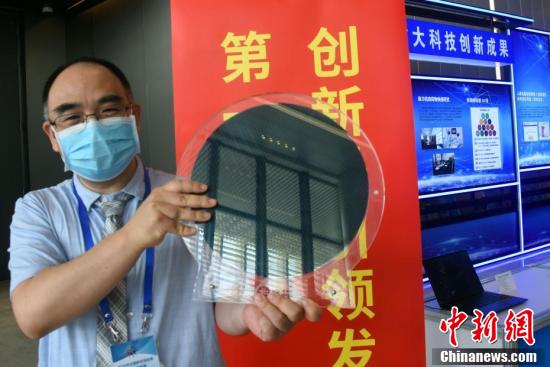 8月23日,中国2020年全国科技活动周暨北京科技周启动式,通过视频连线在北京主会场和湖北武汉分会场同步举行,今年活动周主题为“科技战疫 创新强国”。图为上海兆芯集成电路有限公司研发的一款国产28nm工艺处理器晶圆产品,在启动式上亮相展示。中新社记者 孙自法 摄
