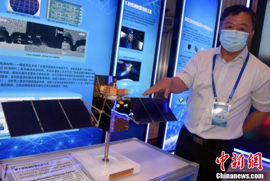 8月23日,中国2020年全国科技活动周暨北京科技周启动式,通过视频连线在北京主会场和湖北武汉分会场同步举行,今年活动周主题为“科技战疫 创新强国”。图为科研人员展示介绍中国科学院高能物理研究所研制的“慧眼”卫星——硬X射线调制望远镜卫星(1:15)模型。中新社记者 孙自法 摄