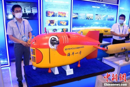 8月23日,中国2020年全国科技活动周暨北京科技周启动式,通过视频连线在北京主会场和湖北武汉分会场同步举行,今年活动周主题为“科技战疫 创新强国”。图为中国科学院沈阳自动化研究所研制的“海斗一号”全海深自主遥控水下机器人(模型),在启动式上亮相展示。中新社记者 孙自法 摄