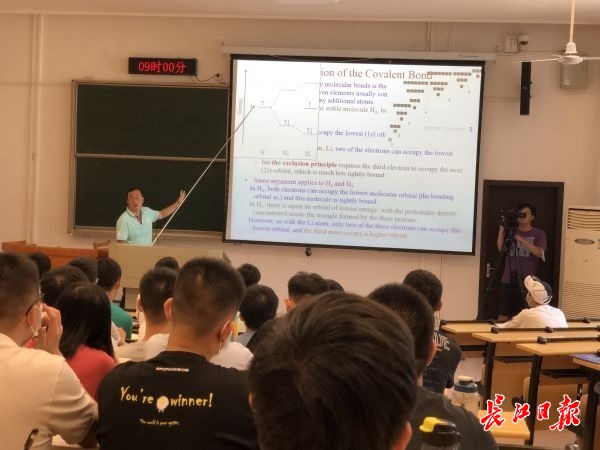 没有铃声。早上8时,武汉大学教四楼101教室。石瑛老师准时开讲,“同学们好!和同学们大半年没见面了!今天我不用激光笔,就用教鞭!”一席话,引得同学们都笑起来。石老师说,网上上课比不上面对面上课,根据学校安排,将用两周时间为同学们补课,今天补讲《大学物理》的“化学键”,台下120名学生听得津津有味。