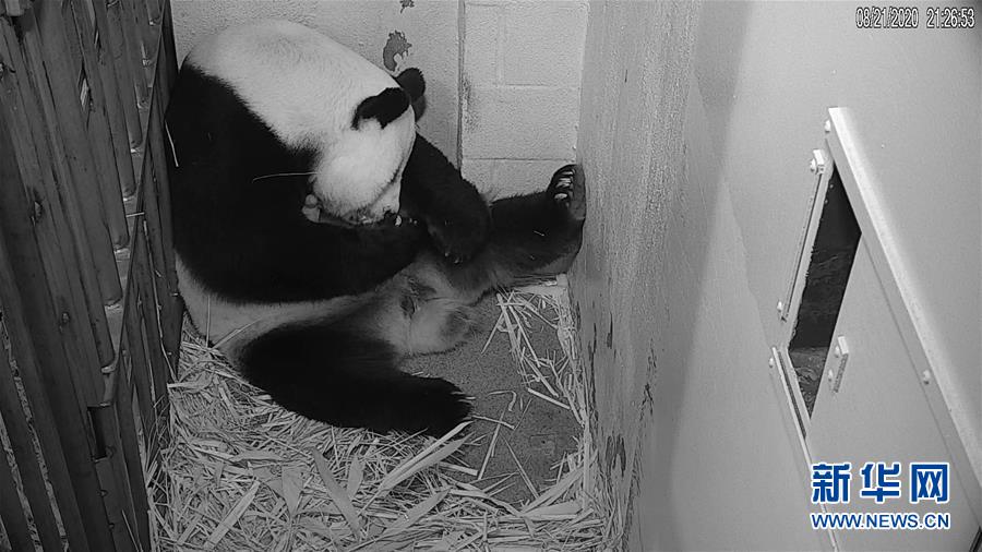 这张8月21日拍摄的视频截图显示的是旅美大熊猫“美香”与刚出生的幼崽在一起。22岁的“美香”当地时间21日傍晚在美国华盛顿史密森学会国家动物园诞下一只幼崽。 新华社发(美国国家动物园供图)