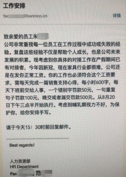 8月24日,网传上海某公司要求一名员工产假期间每天手写销售支持心得,引发网友关注。邮件内容显示,该公司要求该员工每天完成一篇销售支持心得, 每小时600字,“每天下班前交给人事,一个错别字罚款50元,一句重复句子罚款100元。晚交或者漏交罚款 500元。考虑到哺乳期视力不好,为保护你,给你安排手写。”邮箱地址显示,该公司为上海半木轩家具有限公司。