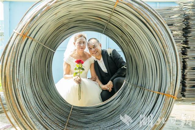 “自从儿女长大后,妻子就一直跟着我在工地上做钢筋工,作为女人,工地上辛苦劳作也是难为她了,我答应过她补拍婚纱照,但忙得抽不开身,一直给耽搁着。”今年52岁的钢筋工黄清明满怀亏欠地说。结婚33年的黄清明夫妻,由于没拍摄过婚纱照,对此次拍摄很是珍惜,前一天特意去理发店理了发、刮了胡子。