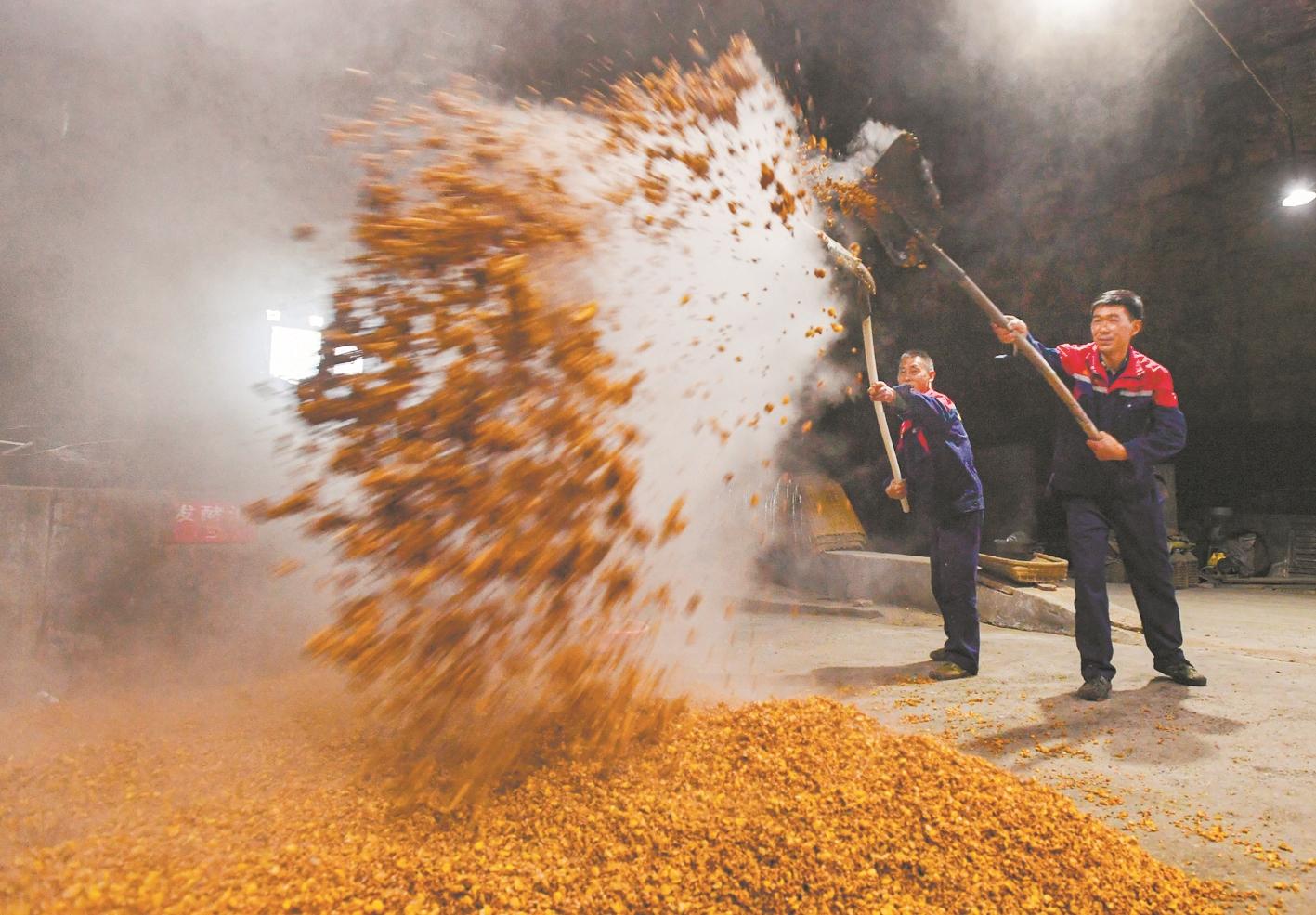 苏丕元(右)将粮食放入锅中蒸煮