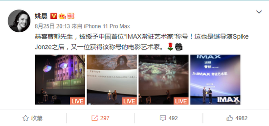 网易娱乐8月26日报道 8月25日晚,姚晨发文祝贺老公曹郁:“恭喜曹郁先生,被授予中国首位"IMAX常驻艺术家"称号!这也是继导演Spike Jonze之后,又一位获得该称号的电影艺术家。”