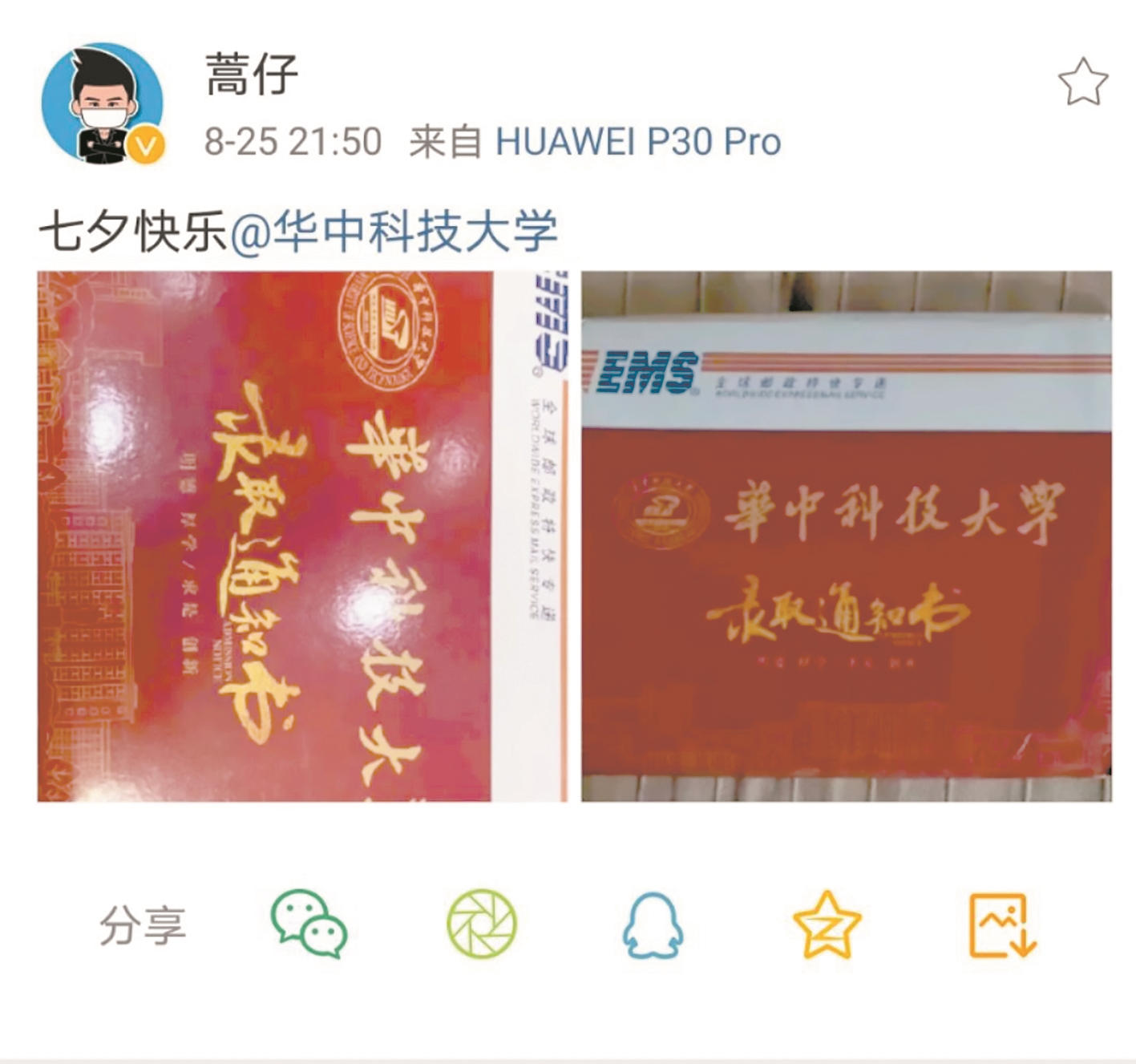 “七夕快乐,@华中科技大学。”8月25日,中国男足国家队队长、武汉伢蒿俊闵在微博上晒出了华中科技大学的录取通知书,专业是运动训练专业(足球方向)。目前,他正随山东鲁能队封闭征战在中超联赛,记者昨日采访了华中科技大学体育学院老师,了解了蒿俊闵与华中大结缘的故事。