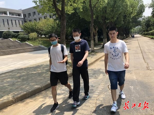 孟兆阳(右)、邹晓阳(中),趁王玉西去实验室路上,咨询一些学业上的问题。 记者胡义华 摄