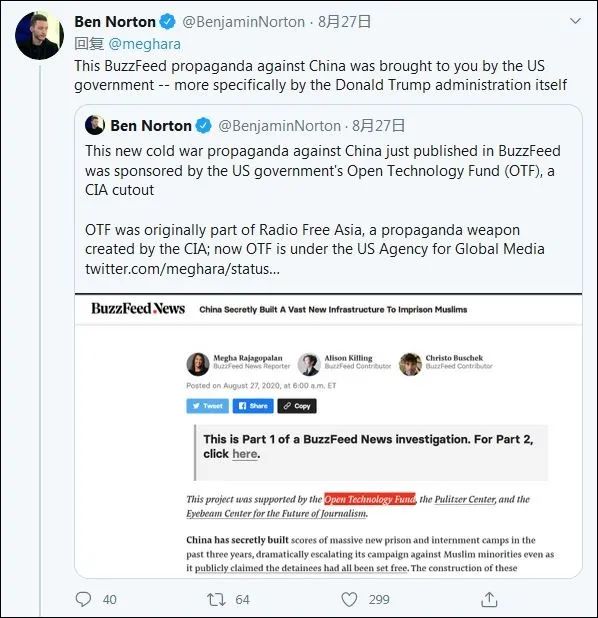 “灰色地带”的另一名编辑本·诺顿同样指出:“‘BuzzFeed’刊出的这一对抗中国的政治宣传,由美国政府带来,确切地说是特朗普政府。”