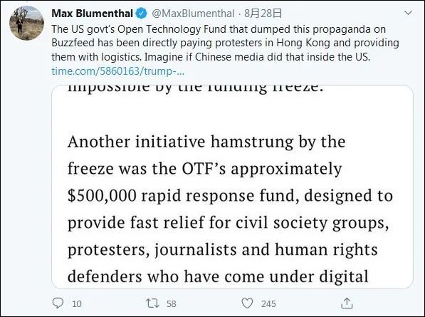 这件事也被常年揭露西方媒体“假新闻”的美国独立媒体“灰色地带”(The Grayzone)注意到了。“灰色地带”编辑麦克斯·布鲁门托(Max Blumenthal)贴出了《时代》杂志的报道截图并表示:“美国政府的‘开放科技基金’在‘BuzzFeed’上倾斜下这堆(涉疆)政治宣传。这家基金会此前曾直接资助香港的抗议者,向他们提供后勤。试想一下,如果中国媒体在美国做这事……”