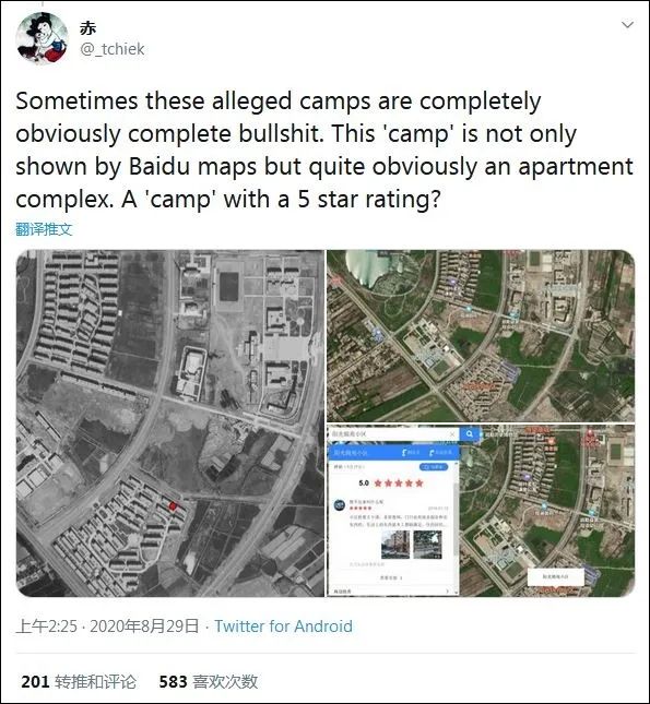 “赤”借此讽刺称:“很明显有时候这些所谓的‘集中营’就是完全胡扯。这处‘集中营’不仅在百度地图上清晰可见,是一处住宅区。一个带有‘5星好评’的‘集中营’?”