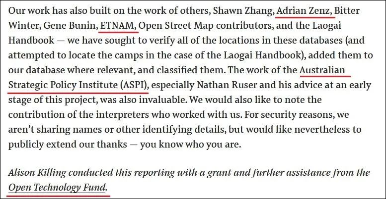 “报告”还鸣谢了所谓的“东突厥斯坦民族觉醒运动”,这个组织明确支持“疆独”,与许多恐怖组织关系密切。澳大利亚战略政策研究所,中国外交部发言人曾点名这家机构:据澳方人士披露,这个机构长期接受来自美国政府和军火商的经费支持,热衷于炮制和炒作各种反华议题,意识形态色彩非常浓厚,实际上是反华势力的“急先锋”,其学术信誉受到严重质疑。