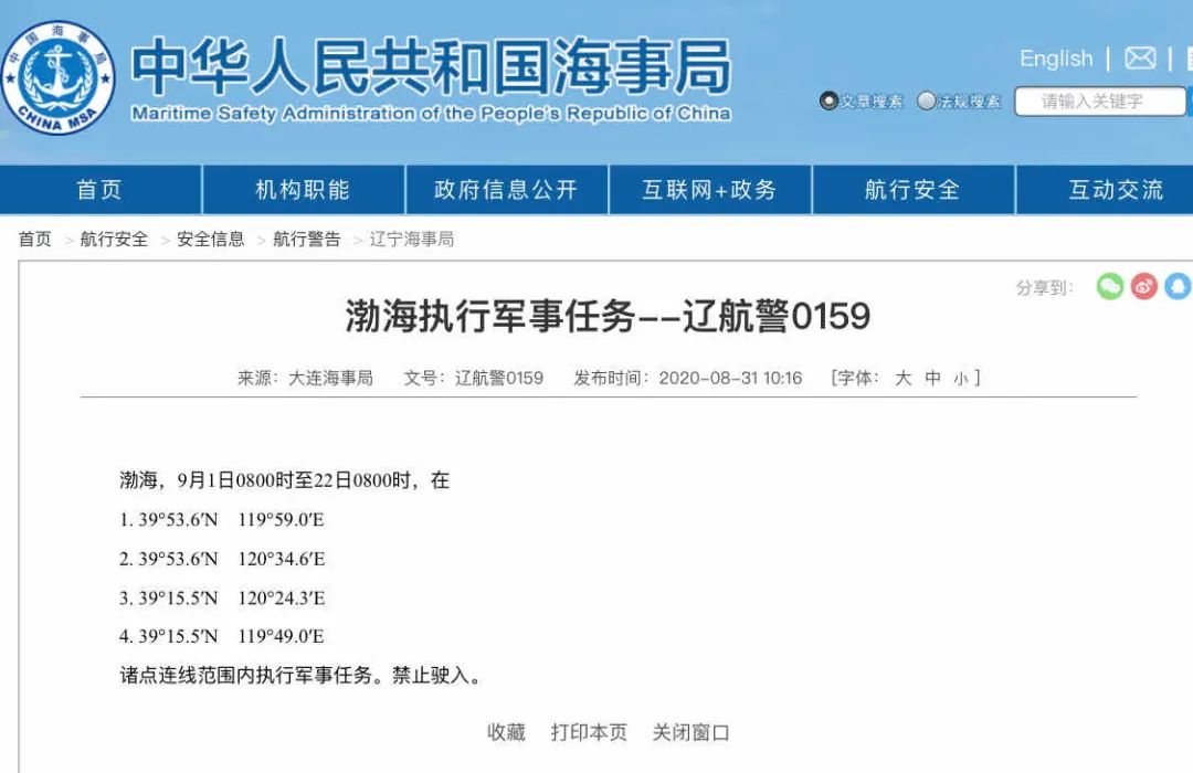 中华人民共和国海事局官网8月31日发布《渤海执行军事任务--辽航警0159》,全文如下: