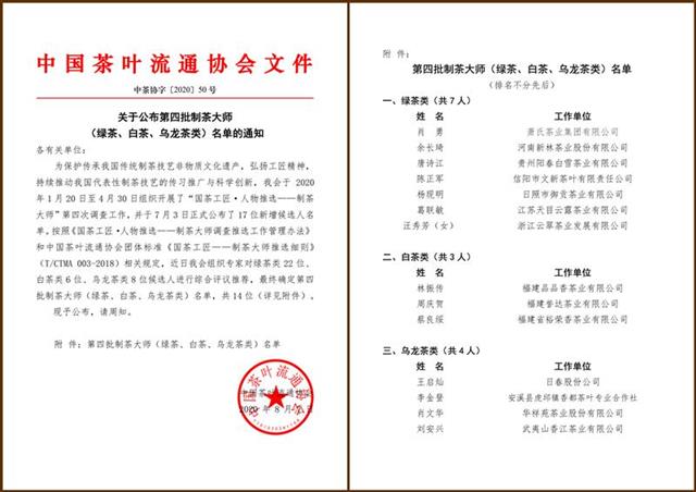 此次中国茶叶流通协会公布的第四批“中国制茶大师”名单,共14名,分绿茶、乌龙茶、白茶三大类,肖勇是目前湖北省绿茶类唯一获此殊荣的一位!