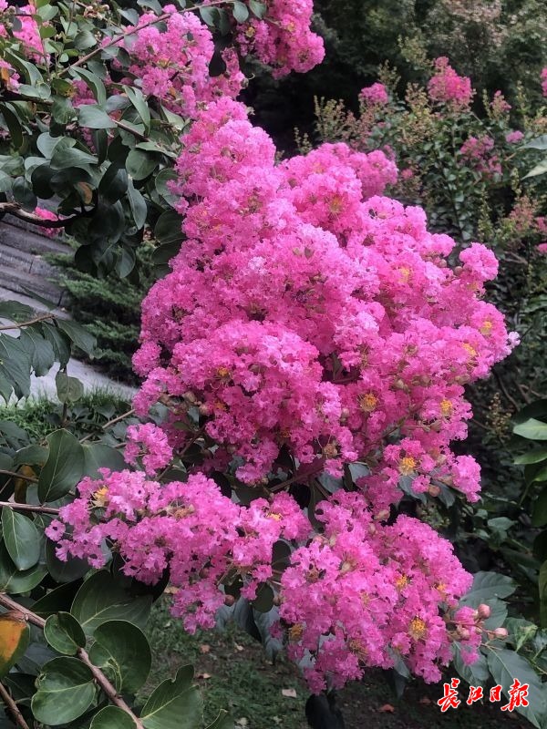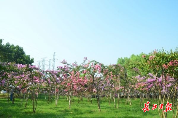 杨春湖公园东区种有300多株园艺紫薇,眼下全部进入盛花期,繁花压弯了枝条,远远望去,如霞似锦。8月31日,洪山区园林和林业局工作人员将该园紫薇开花的盛况分享到朋友圈后,引来大家纷纷点赞:“太美啦!”“繁花似锦!”