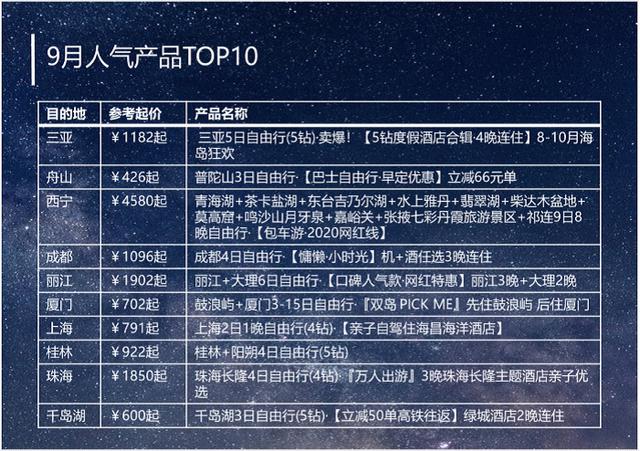 从预订情况看,9月份去哪玩更受欢迎?“9月国内游十大最具人气线路”包括三亚、西宁、成都、丽江、舟山、厦门、上海、桂林、珠海、千岛湖。比如,三亚5日自由行(5钻)双飞4晚连住1182元起、普陀山3日自由行往返巴士+酒店任选426元起、青海省甘肃9日8晚自由行包车游2020网红线4580元起、成都4日自由行机+酒任选3晚连住1096元起、丽江+大理6日自由行热门商圈古城特色客栈1902元起等。海南、四川、云南、华东地区以及海滨城市等,成为“抄底游”的热门。