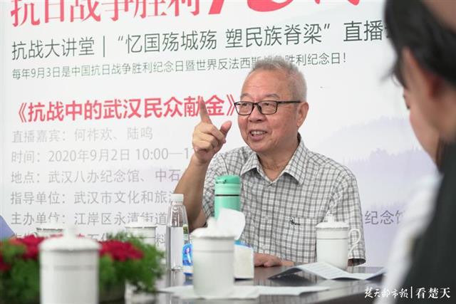 楚天都市报9月2日讯(记者王荣海 通讯员张帆)9月3日是中国人民抗日战争暨世界反法西斯战争胜利75周年纪念日。9月2日,八路军武汉办事处旧址纪念馆(以下简称“武汉八办纪念馆”)举办抗战大讲堂“忆国殇城殇 塑民族脊梁”直播云讲坛活动,武汉著名文化名人何祚欢做客直播间,由发生在1938年的“七七”献金运动入题,以史观今,论及抗击新冠肺炎期间,社会各界捐款支援的善举,激发人民群众的爱国热忱,激励大家牢记使命、砥砺前行。