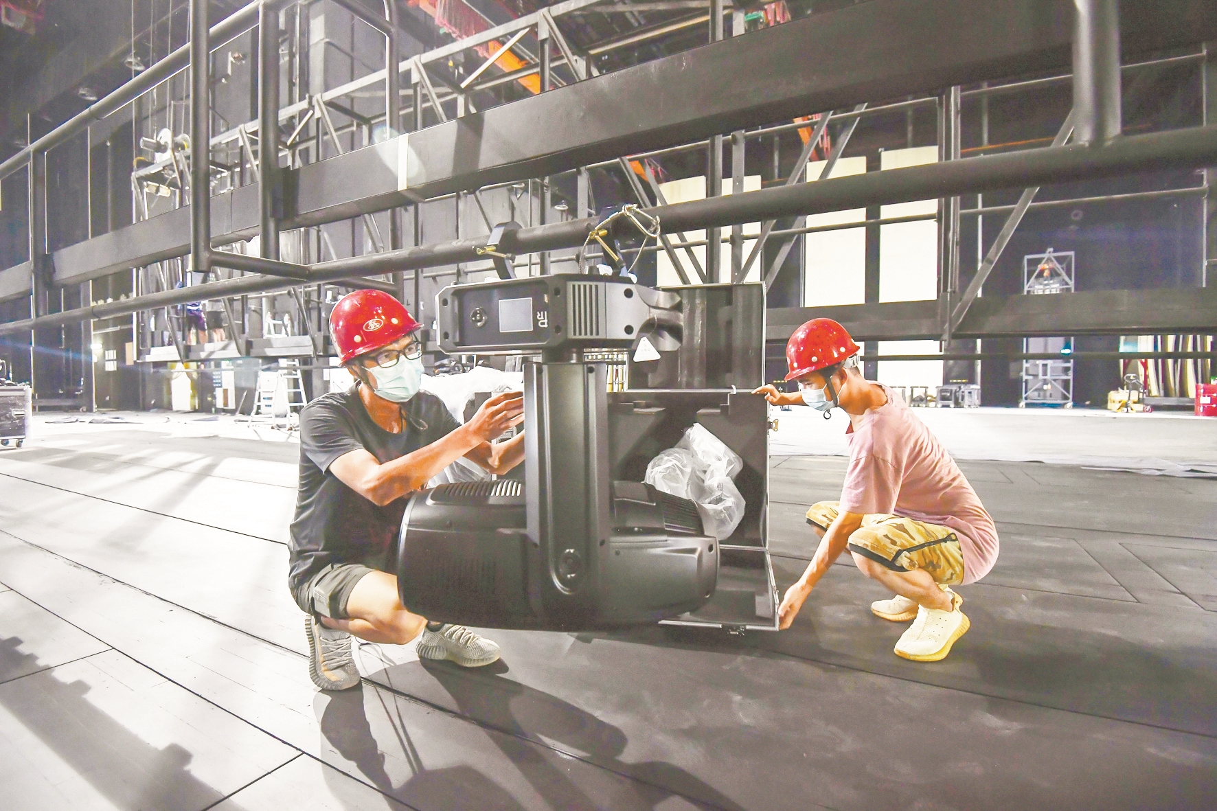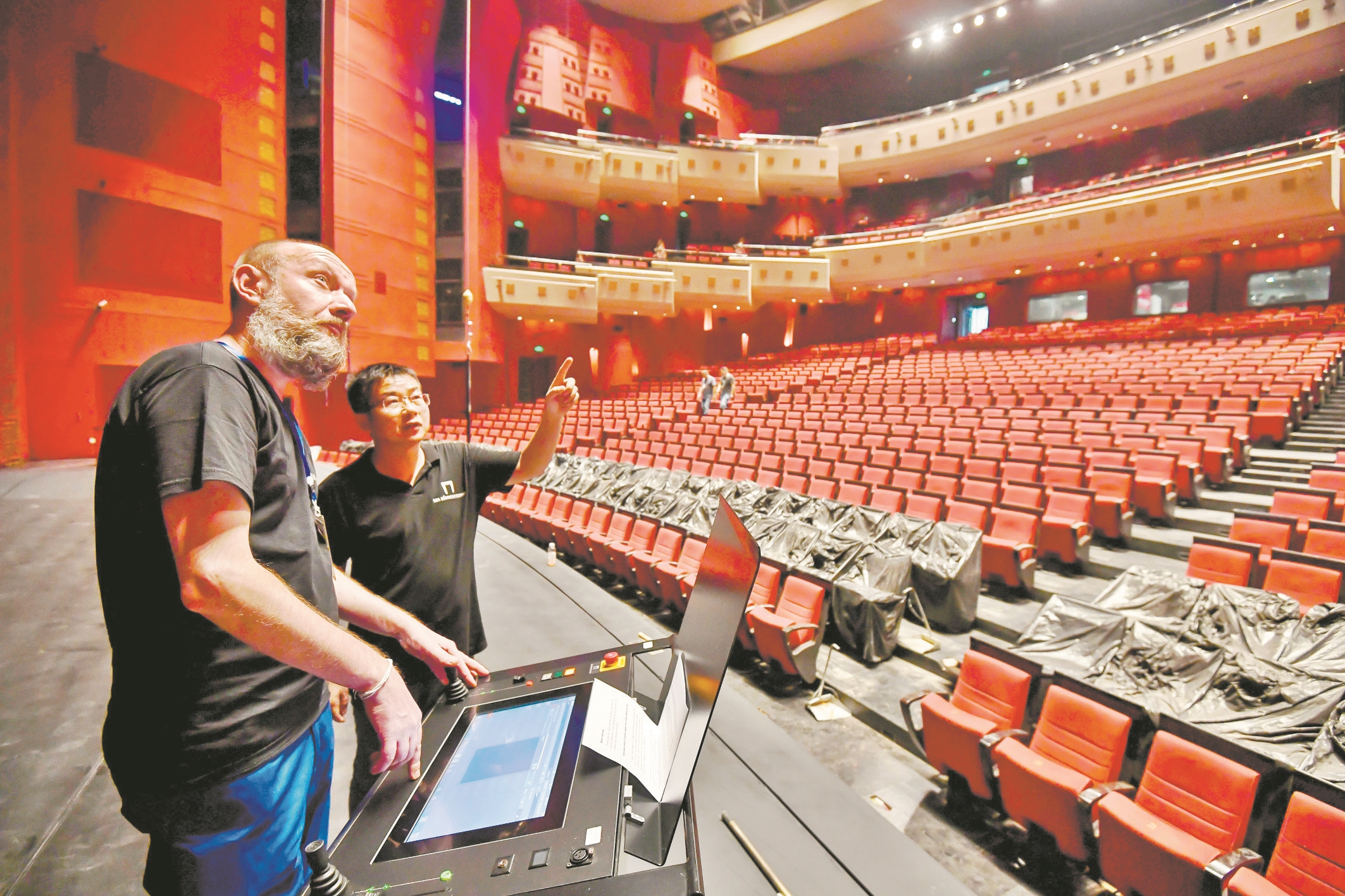 采访当天,已是大剧院维修升级工程的第五个月。曾经上演过著名话剧《茶馆》《北京人》,著名音乐剧《巴黎圣母院》《芝加哥》,著名舞剧《红色娘子军》《天鹅湖》的主舞台已然变成了“工地”,主舞台上空的“渡桥”、灯杆、吊杆随着控制设备上上下下,18米宽的假台口和侧台口随着控制把舞台主界面分割成不同大小的“窗口”……