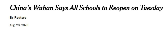 美国《纽约时报》网站8月28日报道,武汉将于9与1日重新开放所有学校和幼儿园。